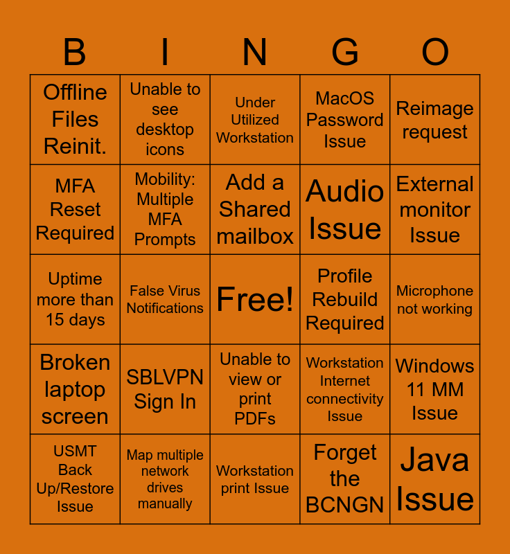 This bingo card has a free space and 24 words: SBLVPN Sign In, Map multiple network drives manually, Add a Shared mailbox, USMT Back Up/Restore Issue, Reimage request, Offline Files Reinit., MFA Reset Required, Unable to see desktop icons, Profile Rebuild Required, Unable to view or print PDFs, Audio Issue, Uptime more than 15 days, Workstation Internet connectivity Issue, Windows 11 MM Issue, Mobility: Multiple MFA Prompts, Forget the BCNGN, Microphone not working, Under Utilized Workstation, External monitor Issue, False Virus Notifications, Java Issue, Broken laptop screen, MacOS Password Issue and Workstation print Issue.