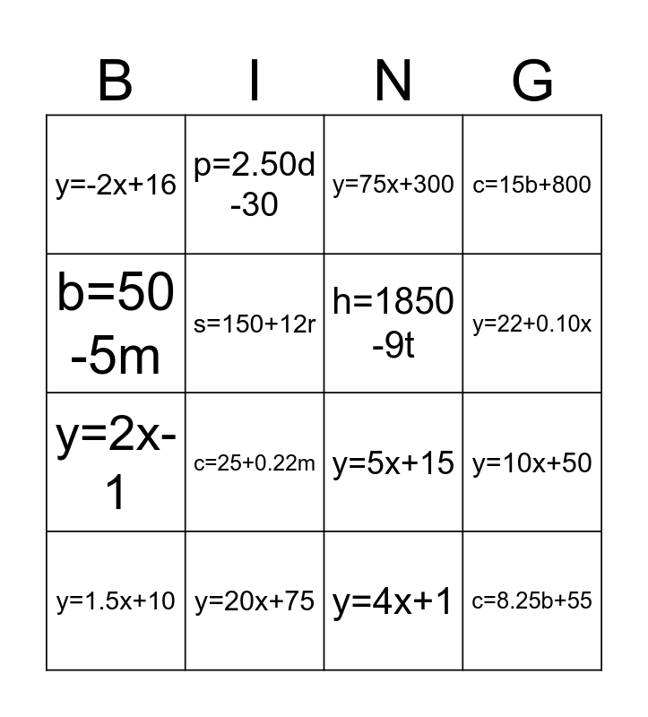 This bingo card has 16 words: y=20x+75, y=10x+50, y=75x+300, y=-2x+16, y=2x-1, p=2.50d -30, y=5x+15, y=4x+1, b=50 -5m, s=150+12r, y=1.5x+10, c=15b+800, c=25+0.22m, y=22+0.10x, h=1850 -9t and c=8.25b+55.