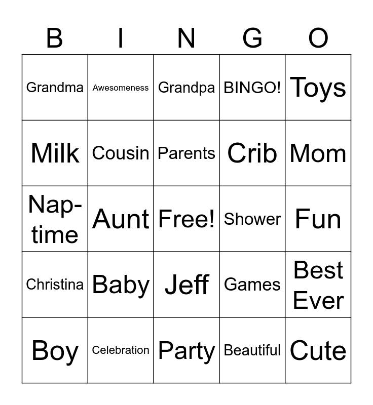 This bingo card has a free space and 29 words: Boy, Girl, Aunt, Uncle, Grandma, Grandpa, Cousin, Baby, Shower, Celebration, Fun, Cute, Party, Beautiful, Mom, Dad, Jeff, Christina, Toys, Nap-time, Games, Happiness, Crib, Milk, BINGO!, Awesomeness, Best Ever, Parents and Heart.
