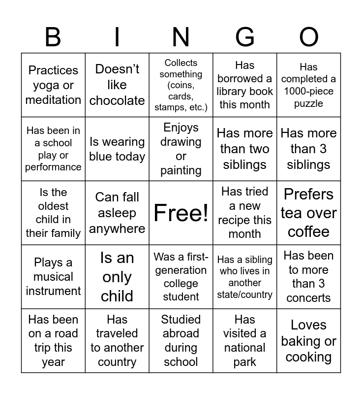 This bingo card has a free space and 62 words: Speaks more than one language, Has traveled to another country, Is left-handed, Plays a musical instrument, Loves spicy food, Has a pet (dog, cat, or other), Is wearing blue today, Was born in another state, Has more than two siblings, Has pulled an all-nighter studying, Has borrowed a library book this month, Has attended a school dance, Has been in a school play or performance, Has run a 5K (or other race), Enjoys hiking, Practices yoga or meditation, Loves baking or cooking, Has completed a 1000-piece puzzle, Can play chess, Enjoys drawing or painting, Has tried a new recipe this month, Collects something (coins, cards, stamps, etc.), Has been on a road trip this year, Has visited a national park, Has taken a cruise, Loves camping, Has met someone famous, Has gone skydiving or bungee jumping, Has been to more than 3 concerts, Has flown on a plane in the last year, Loves roller coasters, Has taken a selfie at a famous landmark, Is an early riser, Loves board games, Prefers tea over coffee, Doesn’t like chocolate, Enjoys scary movies, Loves reading before bed, Can fall asleep anywhere, Likes pineapple on pizza, Is the oldest child in their family, Is the youngest child in their family, Is an only child, Has a twin, Has more than 3 siblings, Has a sibling who lives in another state/country, Has a cousin they are close with, Has children, Has a grandparent still living, Lives with a roommate, Was a first-generation college student, Studied abroad during school, Changed careers at least once, Has an advanced degree (master’s, doctorate), Has lived in another country for more than 6 months, Has been on TV or radio, Has been interviewed for a newspaper/blog, Has shaken hands with a celebrity, Has performed on stage (music, theater, comedy), Has won a contest or award, Has broken a bone and Has been in an ambulance.