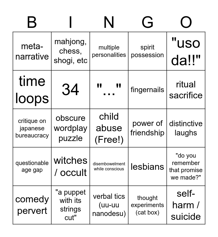 This bingo card has a free space and 24 words: witches / occult, "a puppet with its strings cut", "...", comedy pervert, "uso da!!", meta-narrative, time loops, mahjong, chess, shogi, etc, power of friendship, disembowelment while conscious, fingernails, critique on japanese bureaucracy, lesbians, "do you remember that promise we made?", 34, thought experiments (cat box), distinctive laughs, multiple personalities, ritual sacrifice, obscure wordplay puzzle, self-harm / suicide, questionable age gap, spirit possession and verbal tics (uu-uu nanodesu).