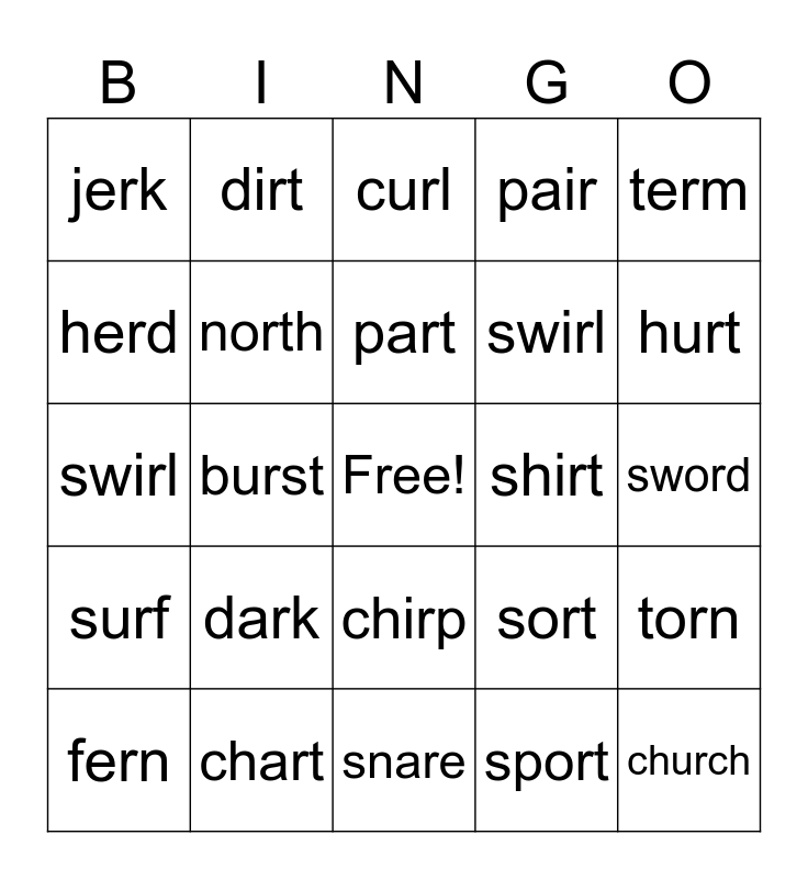 This bingo card has a free space and 24 words: dark, chart, part, fern, term, jerk, herd, dirt, shirt, chirp, swirl, swirl, sort, torn, north, sport, sword, curl, hurt, burst, church, surf, pair and snare.