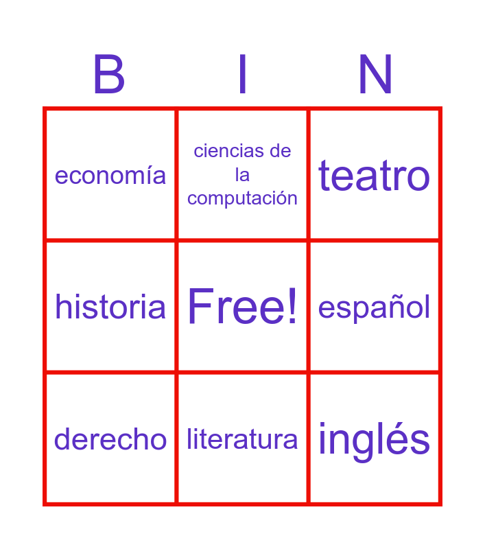 This bingo card has a free space and 18 words: antropología, danza, teatro, economía, química, historia, medicina, ciencias de la computación, literatura, periodismo, biología, inglés, negocios, español, derecho, estadística, ingeniería and mercadotecnia.