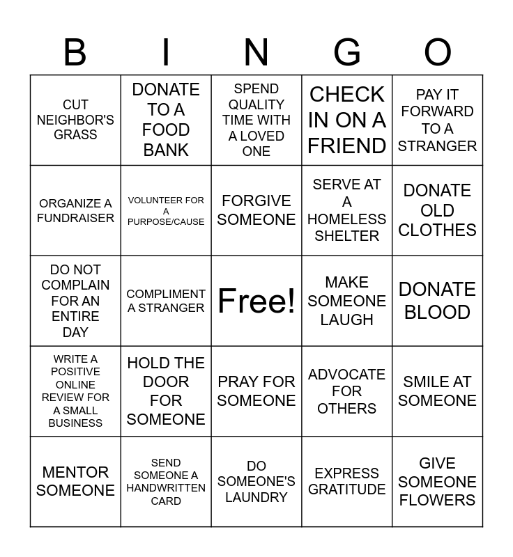 This bingo card has a free space and 24 words: HOLD THE DOOR FOR SOMEONE, SEND SOMEONE A HANDWRITTEN CARD, FORGIVE SOMEONE, MENTOR SOMEONE, PAY IT FORWARD TO A STRANGER, CUT NEIGHBOR'S GRASS, ORGANIZE A FUNDRAISER, DONATE TO A FOOD BANK, MAKE SOMEONE LAUGH, PRAY FOR SOMEONE, SERVE AT A HOMELESS SHELTER, DO NOT COMPLAIN FOR AN ENTIRE DAY, ADVOCATE FOR OTHERS, SMILE AT SOMEONE, VOLUNTEER FOR A PURPOSE/CAUSE, EXPRESS GRATITUDE, DONATE BLOOD, SPEND QUALITY TIME WITH A LOVED ONE, DONATE OLD CLOTHES, COMPLIMENT A STRANGER, GIVE SOMEONE FLOWERS, WRITE A POSITIVE ONLINE REVIEW FOR A SMALL BUSINESS, CHECK IN ON A FRIEND and DO SOMEONE'S LAUNDRY.