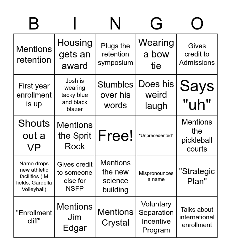 This bingo card has a free space and 25 words: Gives credit to someone else for NSFP, Mentions Crystal, Stumbles over his words, "Enrollment cliff", Gives credit to Admissions, Mentions retention, First year enrollment is up, Housing gets an award, "Unprecedented", Mentions the new science building, Does his weird laugh, Shouts out a VP, Mispronounces a name, "Strategic Plan", Josh is wearing tacky blue and black blazer, Anne gets her picture taken, Mentions the pickleball courts, Plugs the retention symposium, Says "uh", Mentions the Sprit Rock, Talks about international enrollment, Mentions Jim Edgar, Name drops new athletic facilities (IM fields, Gardella Volleyball), Wearing a bow tie and Voluntary Separation Incentive Program.