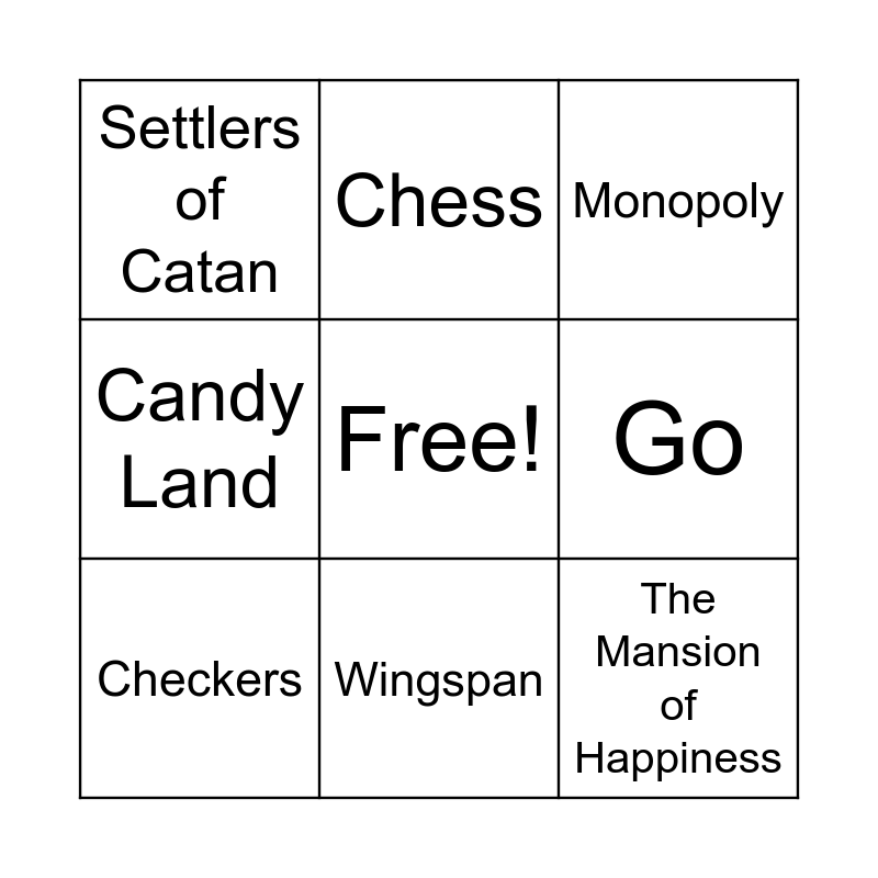 This bingo card has a free space and 10 words: Wingspan, Monopoly, Settlers of Catan, The Mansion of Happiness, Candy Land, Checkers, Chess, Backgammon, Go and Senet.