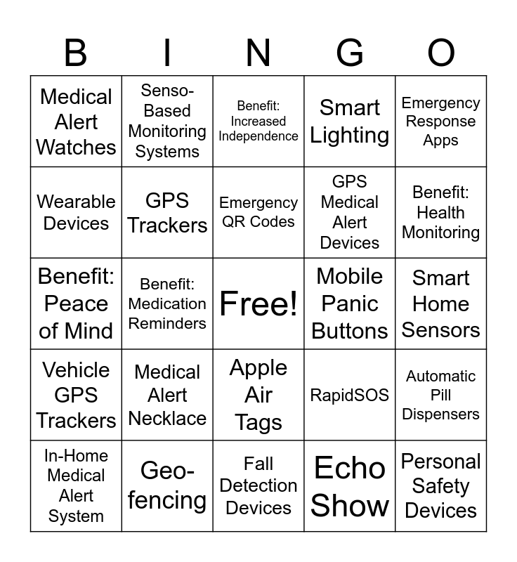 This bingo card has a free space and 25 words: Medical Alert Necklace, Fall Detection Devices, Emergency QR Codes, In-Home Medical Alert System, Emergency Response Apps, Medical Alert Watches, Wearable Devices, Senso-Based Monitoring Systems, Mobile Panic Buttons, Apple Air Tags, GPS Medical Alert Devices, Benefit: Peace of Mind, RapidSOS, Automatic Pill Dispensers, GPS Trackers, Benefit: Quick Access to Emergency Services, Smart Home Sensors, Benefit: Increased Independence, Benefit: Health Monitoring, Benefit: Medication Reminders, Personal Safety Devices, Geo-fencing, Vehicle GPS Trackers, Smart Lighting and Echo Show.