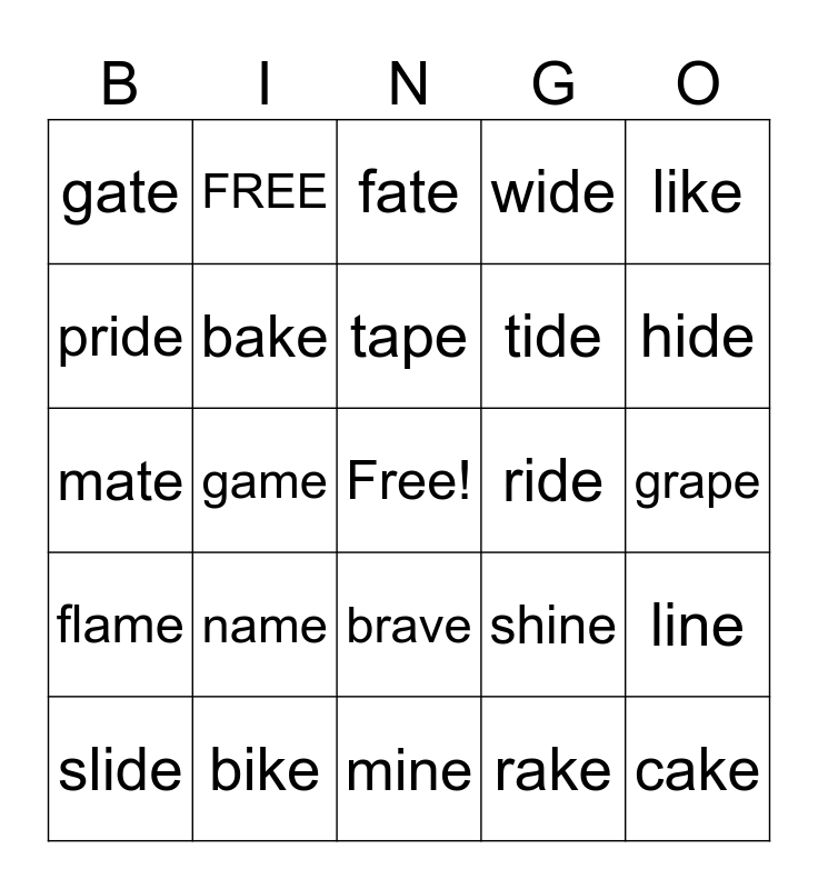 This bingo card has a free space and 25 words: name, mine, tape, slide, like, gate, pride, FREE, ride, brave, tide, mate, shine, line, bake, pine, grape, fate, hide, game, cake, bike, flame, wide and rake.