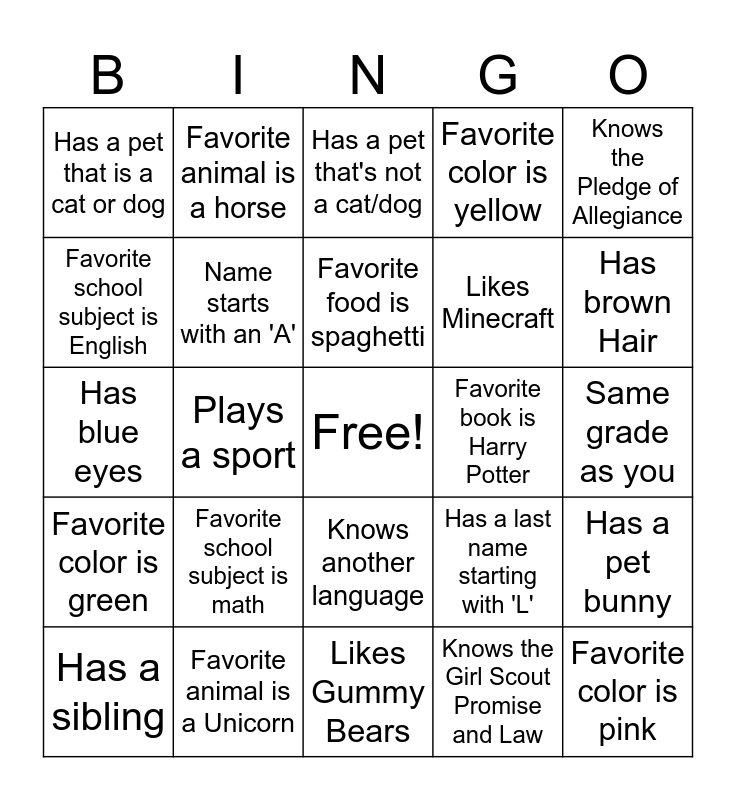 This bingo card has a free space and 29 words: Has a sibling, Has the same favorite singer as you, Plays a sport, Has freckles, Has a pet that is a cat or dog, Has a pet that's not a cat/dog, Name starts with an 'A', Favorite school subject is math, Favorite book is Harry Potter, Favorite animal is a Unicorn, Same grade as you, Favorite color is pink, Likes Gummy Bears, Knows the Girl Scout Promise and Law, Has brown Hair, Has a younger sibling, Knows another language, Favorite color is green, Knows the Pledge of Allegiance, Has blue eyes, Has a last name starting with 'L', Has glasses, Likes Minecraft, Favorite school subject is English, Favorite color is yellow, Favorite animal is a horse, Has a pet bunny, Favorite food is spaghetti and Knows the alphabet backwards.
