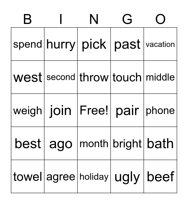 This bingo card has a free space and 24 words: ago, agree, throw, towel, vacation, spend, west, hurry, pair, month, touch, weigh, bright, bath, second, ugly, phone, pick, middle, join, beef, best, past and holiday.