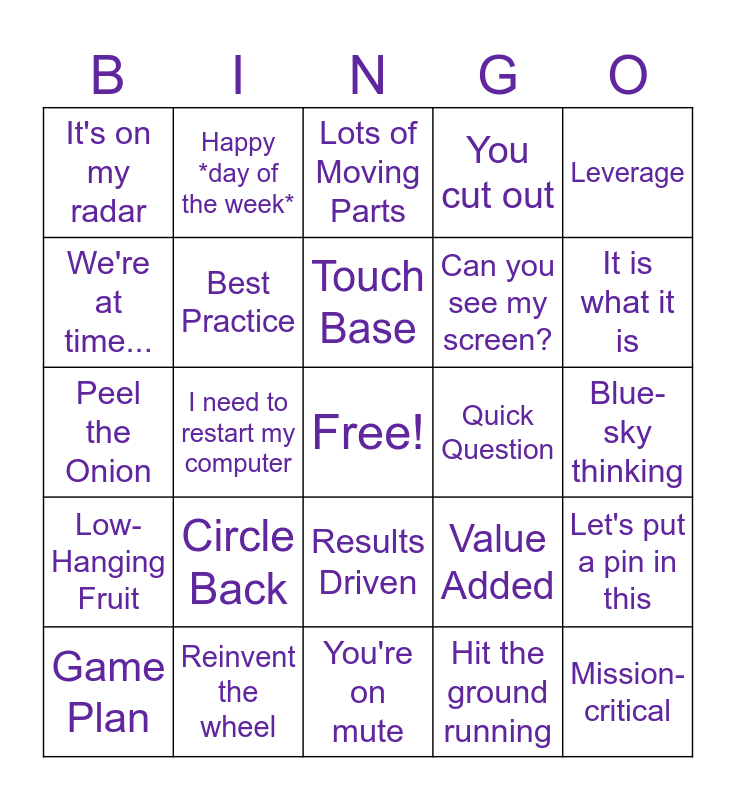 This bingo card has a free space and 34 words: Deep Dive, Hit the ground running, I don't have the Bandwidth, Action Item, Low-Hanging Fruit, Best Practice, Leverage, Game Plan, Happy *day of the week*, Scalable, Touch Base, Lots of Moving Parts, Drill Down, The Ask, Quick Question, It is what it is, Reinvent the wheel, Peel the Onion, Circle Back, Value Added, Results Driven, Drink the Kool-Aid, It's on my radar, Blue-sky thinking, You're on mute, Mission-critical, You cut out, You're frozen, Can you see my screen?, We're at time..., Let's take this offline, I need to restart my computer, Let's put a pin in this and *unintended background noise*.