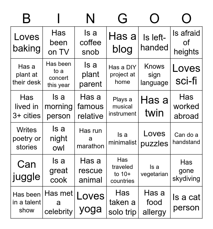 This bingo card has 48 words: Has worked in both P&C and Life, Has lived in 3+ cities, Has broken a bone, Loves puzzles, Has a twin, Has traveled to 10+ countries, Has been on TV, Speaks 3+ languages, Is afraid of heights, Has met a celebrity, Has a plant at their desk, Has a blog, Is a night owl, Writes poetry or stories, Is a cat person, Has a rescue animal, Has been to a concert this year, Is a morning person, Loves karaoke, Is left-handed, Loves sci-fi, Can do a handstand, Loves baking, Is a plant parent, Is a tea lover, Has a DIY project at home, Has run a marathon, Has read 20+ books this year, Has worked abroad, Plays a musical instrument, Is a dog person, Is a great cook, Has a food allergy, Debugged for 3+ hours straight, Is a minimalist, Loves yoga, Has taken a solo trip, Has a famous relative, Has been in a talent show, Has a pet that joins Team calls, Is a vegetarian, Can juggle, Is a coffee snob, SAS survivor, Knows sign language, Ctrl+Z as life philosophy, Has gone skydiving and Has a birthday this month.