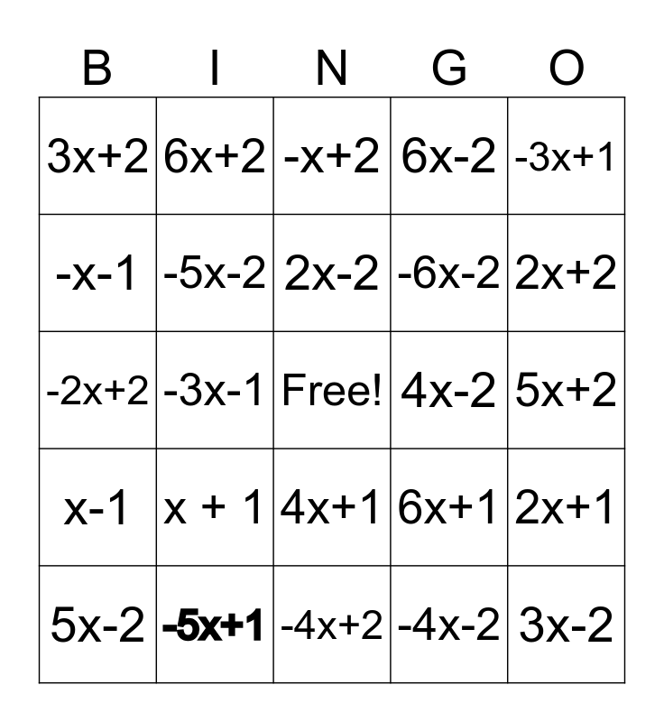 This bingo card has a free space and 24 words: x + 1, -5x+1, 2x-2, 5x-2, -3x+1, 3x+2, -x-1, 6x+2, 4x-2, 4x+1, -6x-2, -2x+2, 6x+1, 2x+1, -5x-2, -4x-2, 5x+2, -x+2, 2x+2, -3x-1, 3x-2, x-1, 6x-2 and -4x+2.