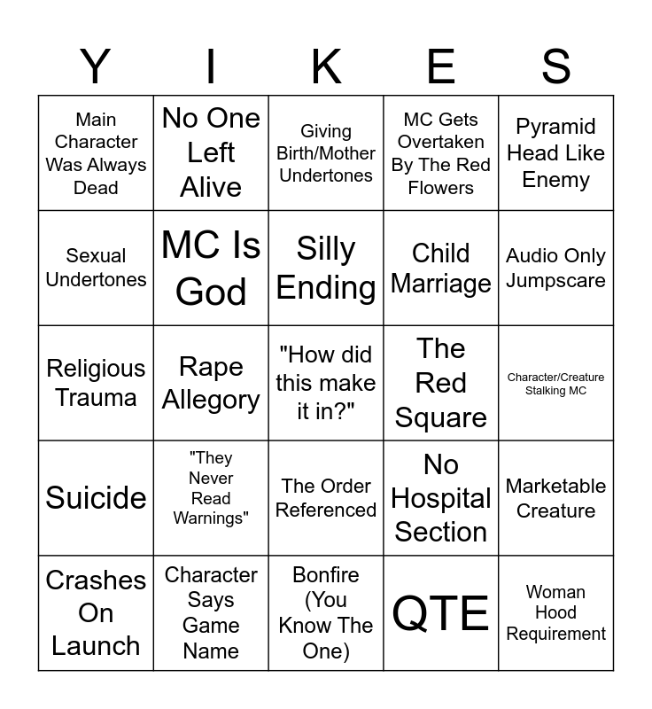 This bingo card has a free space and 24 words: "They Never Read Warnings", Character Says Game Name, Silly Ending, Crashes On Launch, Pyramid Head Like Enemy, Main Character Was Always Dead, Sexual Undertones, No One Left Alive, The Red Square, The Order Referenced, Child Marriage, Religious Trauma, No Hospital Section, Marketable Creature, MC Is God, QTE, Character/Creature Stalking MC, Giving Birth/Mother Undertones, Audio Only Jumpscare, Rape Allegory, Woman Hood Requirement, Suicide, MC Gets Overtaken By The Red Flowers and Bonfire (You Know The One).