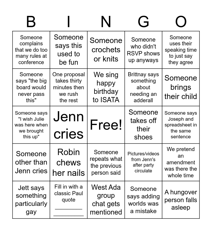 This bingo card has a free space and 24 words: Robin chews her nails, Fill in with a classic Paul quote _________ __________, We sing happy birthday to ISATA, Jett says something particularly gay, Someone uses their speaking time to just say they agree, Someone complains that we do too many rules at conference, Someone says "the big board would never pass this", Someone says this used to be fun, Someone takes off their shoes, Someone repeats what the previous person said, Brittnay says something about needing an adderall, Someone says "I wish Julie was here when we brought this up", Pictures/videos from Jenn's after party circulate, We pretend an amendment was there the whole time, One proposal takes thirty minutes then we rush the rest, Someone says adding worlds was a mistake, Someone says Joseph and spreadsheet in the same sentence, Someone crochets or knits, Someone brings their child, Jenn cries, A hungover person falls asleep, Someone other than Jenn cries, Someone who didn't RSVP shows up anyways and West Ada group chat gets mentioned.