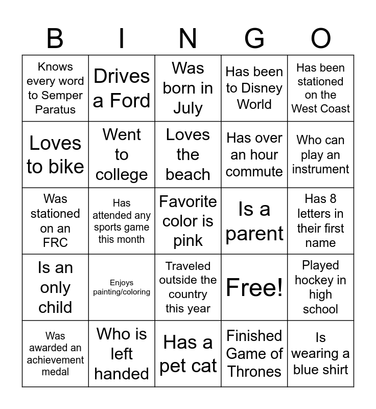 This bingo card has 27 words: Free!, Is wearing a blue shirt, Has over an hour commute, Has a pet cat, Loves to bike, Was born in July, Drives a Ford, Is an only child, Is a parent, Played hockey in high school, Was stationed on an FRC, Has been to Disney World, Was awarded an achievement medal, Who is left handed, Who can play an instrument, Speaks more than 1 language, Went to college, Loves the beach, Enjoys painting/coloring, Knows every word to Semper Paratus, Has 8 letters in their first name, Finished Game of Thrones, Has attended any sports game this month, Favorite color is pink, Traveled outside the country this year, Has been stationed on the West Coast and Has read a Harry Potter book.