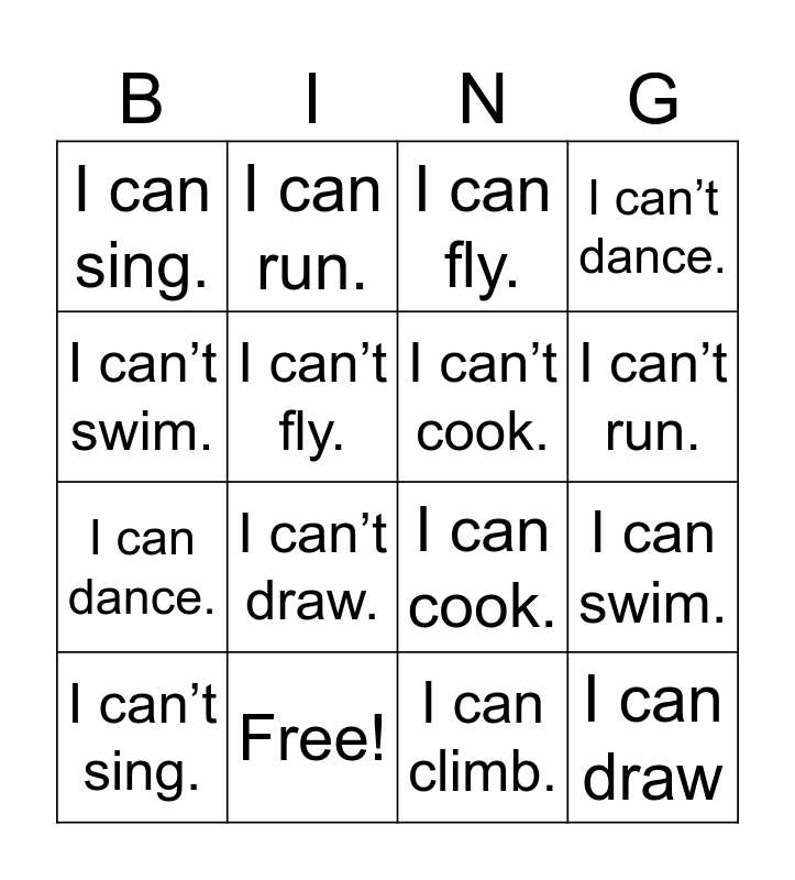 This bingo card has 16 words: Free!, I can swim., I can fly., I can sing., I can dance., I can run., I can cook., I can climb., I can’t swim., I can’t fly., I can’t sing., I can’t dance., I can’t draw., I can’t run., I can’t cook. and I can draw.