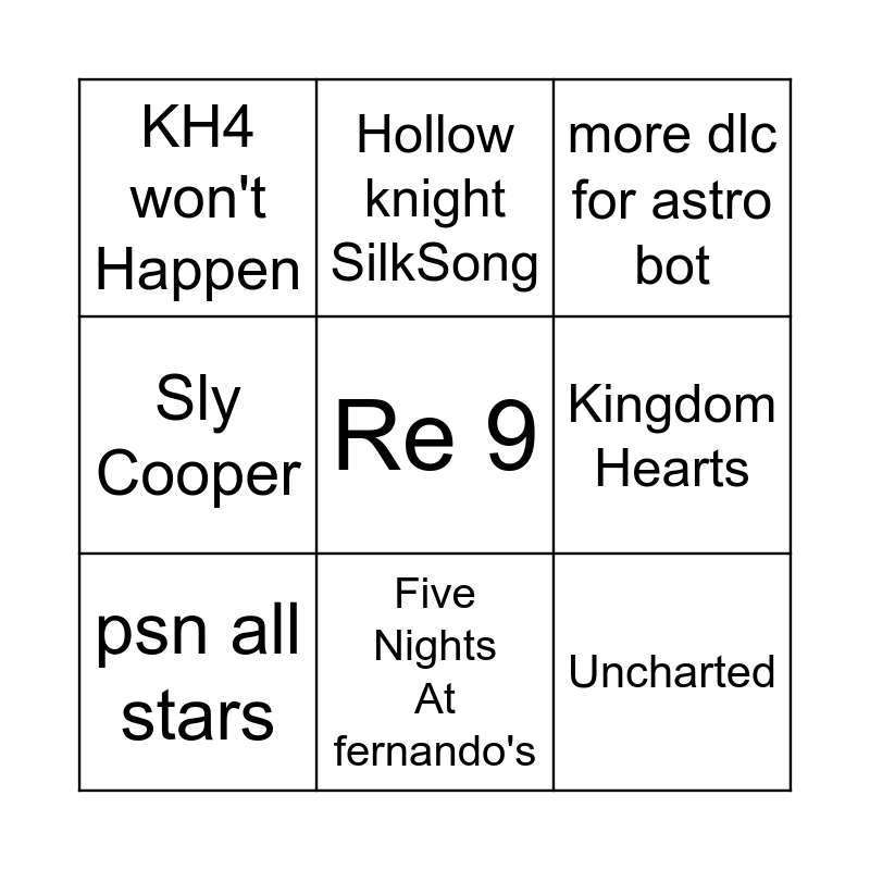 This bingo card has 33 words: God of War 2D, FF7 part 3 title reveal, Ghost of Yōtei final trailer, wolverine, Free!, RE9, KH4 won't Happen, intergalactic, more dlc for astro bot, V.R, Five Nights At fernando's, Kingdom Hearts, Horizon Zero Dawn, Black myth wukong dlc, Psn Tornaments, psn all stars, New Controller, Retro console, Ace Combat 8, Psn Game Pass, PlayStation Exclusive, New Astro Bot, Hollow knight SilkSong, Intergalactic, another spiderman, Death standing 2, Uncharted, Sly Cooper, Re 9, Jax and Daxter, team ico, infamous and gta 6.