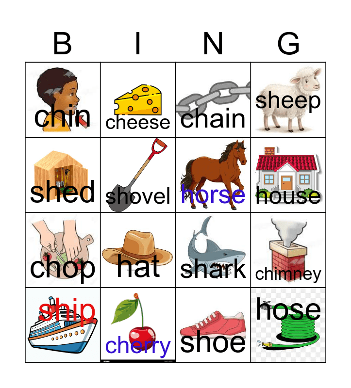 This bingo card has 16 images and 16 words: cherry, chimney, chain, chin, chop, cheese, shark, shoe, shed, shovel, ship, sheep, hat, house, horse and hose.