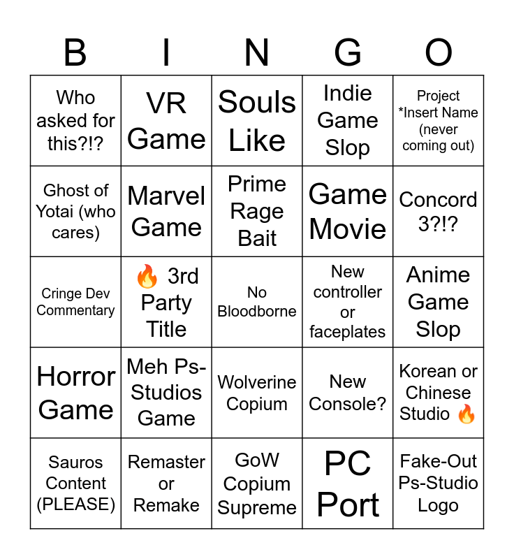This bingo card has a free space and 24 words: Meh Ps-Studios Game, Remaster or Remake, Prime Rage Bait, Sauros Content (PLEASE), Project *Insert Name (never coming out), Who asked for this?!?, Ghost of Yotai (who cares), VR Game, New controller or faceplates, Wolverine Copium, Game Movie, Cringe Dev Commentary, New Console?, Korean or Chinese Studio 🔥, Marvel Game, PC Port, Anime Game Slop, Souls Like, Concord 3?!?, 🔥 3rd Party Title, Fake-Out Ps-Studio Logo, Horror Game, Indie Game Slop and GoW Copium Supreme.