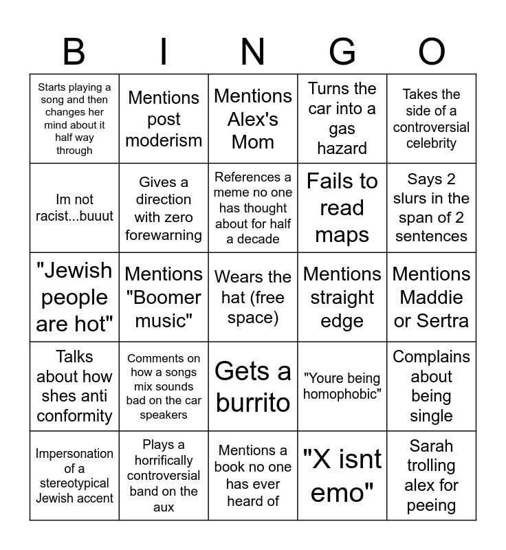 This bingo card has a free space and 24 words: Comments on how a songs mix sounds bad on the car speakers, Plays a horrifically controversial band on the aux, References a meme no one has thought about for half a decade, Impersonation of a stereotypical Jewish accent, Takes the side of a controversial celebrity, Starts playing a song and then changes her mind about it half way through, Im not racist...buuut, Mentions post moderism, Mentions straight edge, Gets a burrito, Fails to read maps, "Jewish people are hot", "Youre being homophobic", Complains about being single, Gives a direction with zero forewarning, "X isnt emo", Mentions Maddie or Sertra, Mentions Alex's Mom, Says 2 slurs in the span of 2 sentences, Mentions "Boomer music", Sarah trolling alex for peeing, Talks about how shes anti conformity, Turns the car into a gas hazard and Mentions a book no one has ever heard of.
