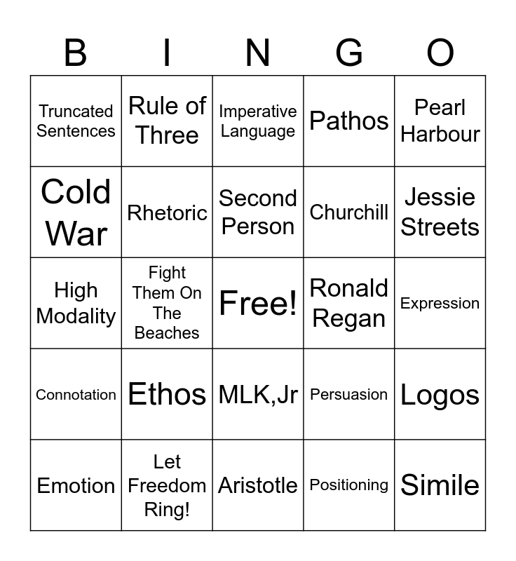 This bingo card has a free space and 24 words: Ethos, Let Freedom Ring!, Second Person, Emotion, Pearl Harbour, Truncated Sentences, Cold War, Rule of Three, Ronald Regan, MLK,Jr, Churchill, High Modality, Persuasion, Logos, Rhetoric, Positioning, Expression, Imperative Language, Jessie Streets, Fight Them On The Beaches, Simile, Connotation, Pathos and Aristotle.