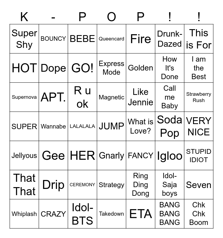 This bingo card has a free space and 48 words: Ring Ding Dong, How It's Done, Takedown, Wannabe, R u ok, VERY NICE, BOUNCY, CRAZY, Drunk-Dazed, Gnarly, This is For, Queencard, Call me Baby, Like Jennie, That That, Soda Pop, HOT, I am the Best, Idol-Saja boys, Fire, Golden, LALALALA, Super Shy, Dope, Seven, GO!, Strawberry Rush, Whiplash, Magnetic, APT., BANG BANG BANG, What is Love?, STUPID IDIOT, Drip, SUPER, FANCY, Igloo, Supernova, HER, CEREMONY, Jellyous, Chk Chk Boom, BEBE, Idol-BTS, Express Mode, Strategy, Gee and ETA.