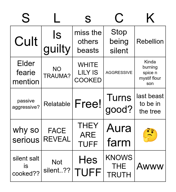 This bingo card has a free space and 24 words: FACE REVEAL, Not silent..??, WHITE LILY IS COOKED, silent salt is cooked??, Rebellion, Cult, Elder fearie mention, Is guilty, Turns good?, THEY ARE TUFF, AGGRESSIVE, passive aggressive?, Aura farm, 🤔, NO TRAUMA?, KNOWS THE TRUTH, last beast to be in the tree, miss the others beasts, Kinda burning spice n mystif flour son, Relatable, Awww, why so serious, Stop being silent and Hes TUFF.