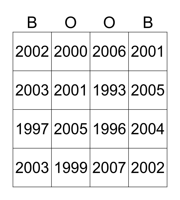 This bingo card has 24 words: 2007, 2006, 2005, 2004, 2003, 2002, 2001, 2000, 1999, 1998, 1997, 1996, 1995, 1994, 1993, 1992, 2007, 2006, 2005, 2004, 2003, 2002, 2001 and 2000.