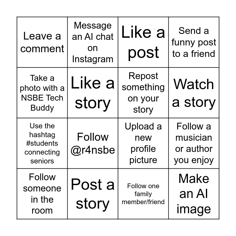 This bingo card has 16 words: Post a story, Follow a musician or author you enjoy, Like a post, Leave a comment, Use the hashtag #students connecting seniors, Message an AI chat on Instagram, Upload a new profile picture, Follow one family member/friend, Take a photo with a NSBE Tech Buddy, Like a story, Follow someone in the room, Send a funny post to a friend, Follow @r4nsbe, Watch a story, Repost something on your story and Make an AI image.