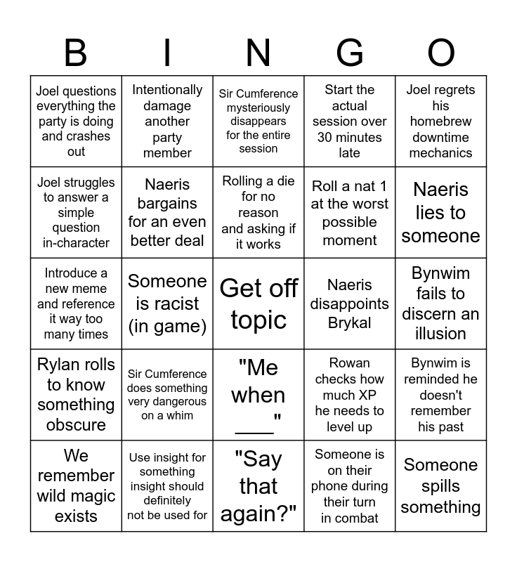 This bingo card has a free space and 24 words: Sir Cumference does something very dangerous on a whim, Use insight for something insight should definitely not be used for, Rolling a die for no reason and asking if it works, We remember wild magic exists, Joel regrets his homebrew downtime mechanics, Joel questions everything the party is doing and crashes out, Joel struggles to answer a simple question in-character, Intentionally damage another party member, Naeris disappoints Brykal, "Me when ___", Roll a nat 1 at the worst possible moment, Introduce a new meme and reference it way too many times, Rowan checks how much XP he needs to level up, Bynwim is reminded he doesn't remember his past, Naeris bargains for an even better deal, Someone is on their phone during their turn in combat, Bynwim fails to discern an illusion, Sir Cumference mysteriously disappears for the entire session, Naeris lies to someone, Someone is racist (in game), Someone spills something, Rylan rolls to know something obscure, Start the actual session over 30 minutes late and "Say that again?".