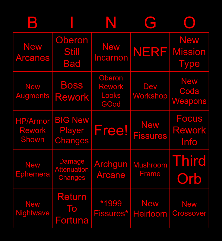 This bingo card has a free space and 24 words: Damage Attenuation Changes, Return To Fortuna, Oberon Rework Looks GOod, New Nightwave, New Mission Type, New Arcanes, New Augments, Oberon Still Bad, New Fissures, Archgun Arcane, Dev Workshop, HP/Armor Rework Shown, Mushroom Frame, Third Orb, Boss Rework, New Heirloom, Focus Rework Info, New Incarnon, New Coda Weapons, BIG New Player Changes, New Crossover, New Ephemera, NERF and *1999 Fissures*.