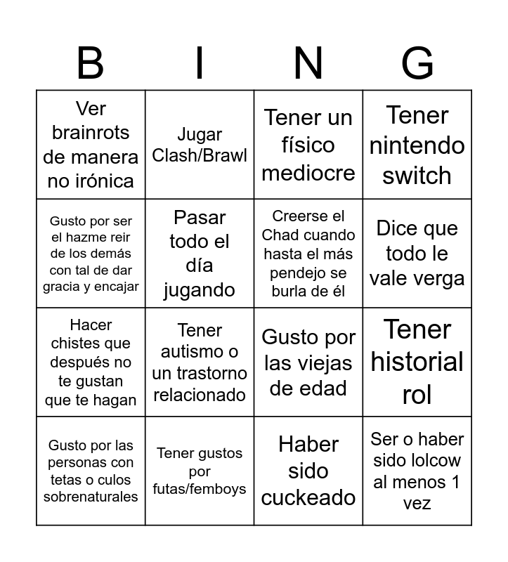 This bingo card has 16 words: Tener gustos por futas/femboys, Tener historial rol, Tener un físico mediocre, Ver brainrots de manera no irónica, Hacer chistes que después no te gustan que te hagan, Jugar Clash/Brawl, Gusto por las viejas de edad, Haber sido cuckeado, Gusto por ser el hazme reir de los demás con tal de dar gracia y encajar, Pasar todo el día jugando, Gusto por las personas con tetas o culos sobrenaturales, Tener nintendo switch, Tener autismo o un trastorno relacionado, Dice que todo le vale verga, Creerse el Chad cuando hasta el más pendejo se burla de él and Ser o haber sido lolcow al menos 1 vez.
