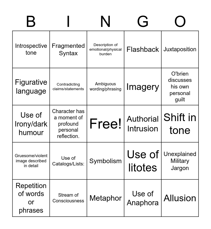 This bingo card has a free space and 24 words: Use of Catalogs/Lists:, Stream of Consciousness, Ambiguous wording/phrasing, Repetition of words or phrases, Juxtaposition, Introspective tone, Figurative language, Fragmented Syntax, Authorial Intrusion, Symbolism, Imagery, Use of Irony/dark humour, Use of litotes, Unexplained Military Jargon, Contradicting claims/statements, Use of Anaphora, Shift in tone, Description of emotional/physical burden, O'brien discusses his own personal guilt, Character has a moment of profound personal reflection., Allusion, Gruesome/violent image described in detail, Flashback and Metaphor.