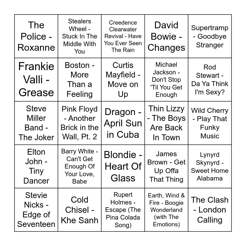 This bingo card has 64 words: Earth, Wind & Fire - September, John Paul Young - Love Is in the Air, The Four Seasons - December, 1963 (Oh What a Night!), Lynyrd Skynyrd - Sweet Home Alabama, ABBA - Gimme! Gimme! Gimme! (A Man After Midnight), Fleetwood Mac - Go Your Own Way, Stealers Wheel - Stuck In The Middle With You, Hot Chocolate - You Sexy Thing, Curtis Mayfield - Move on Up, Queen - Bohemian Rhapsody, Blondie - Heart Of Glass, Don McLean - American Pie, Wild Cherry - Play That Funky Music, Supertramp - Goodbye Stranger, Bee Gees - Stayin' Alive, Frankie Valli - Grease, Pink Floyd - Another Brick in the Wall, Pt. 2, The Police - Roxanne, The Knack - My Sharona, Michael Jackson - Don't Stop 'Til You Get Enough, Barry White - Can't Get Enough Of Your Love, Babe, Elton John - Tiny Dancer, David Bowie - Changes, Carly Simon - You're So Vain, Yusuf / Cat Stevens - Wild World, Gloria Gaynor - I Will Survive, The Buggles - Video Killed The Radio Star, Wings - Live And Let Die, Queen - Don't Stop Me Now, Kate Bush - Wuthering Heights, Commodores - Easy, Neil Diamond - Sweet Caroline, Dolly Parton - Jolene, TOTO - Hold the Line, Rod Stewart - Da Ya Think I'm Sexy?, Stevie Nicks - Edge of Seventeen, Player - Baby Come Back, Earth, Wind & Fire - Boogie Wonderland (with The Emotions), Stealers Wheel - Stuck In The Middle With You, Boston - More Than a Feeling, Steve Miller Band - The Joker, Thin Lizzy - The Boys Are Back In Town, Mungo Jerry - In the Summertime, Hot Chocolate - Every 1's a Winner, Dragon - Are You Old Enough, Dragon - April Sun in Cuba, Cold Chisel - Khe Sanh, The Clash - London Calling, James Brown - Get Up Offa That Thing, CAN - Vitamin C, Candi Staton - Young Hearts Run Free, Daryl Hall & John Oates - Rich Girl, Rupert Holmes - Escape (The Pina Colada Song), Billy Joel - Piano Man, Norman Greenbaum - Spirit In The Sky, Jackson Browne - Running on Empty, Creedence Clearwater Revival - Have You Ever Seen The Rain, John Travolta - Sandy, The Kinks - Lola, Lou Reed - Walk On the Wild Side, Leo Sayer - You Make Me Feel Like Dancing, Derek & The Dominos - Layla, Cheap Trick - I Want You to Want Me and Eagles - Take It Easy.