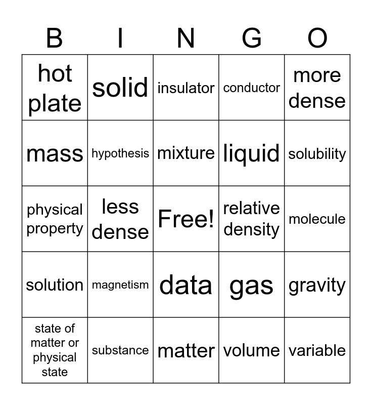 This bingo card has a free space and 26 words: data, volume, mixture, substance, more dense, hot plate, mass, solid, molecule, gas, liquid, physical property, gravity, state of matter or physical state, less dense, force, conductor, solution, insulator, variable, solubility, matter, relative density, magnetism, hypothesis and friction.