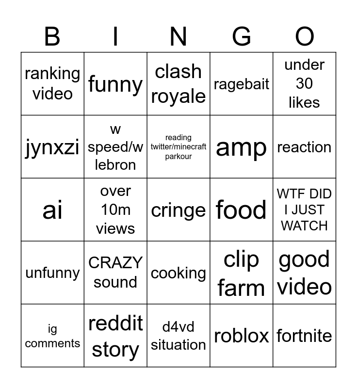This bingo card has a free space and 24 words: CRAZY sound, reddit story, reading twitter/minecraft parkour, ig comments, under 30 likes, ranking video, jynxzi, funny, food, cooking, amp, ai, clip farm, good video, w speed/w lebron, roblox, WTF DID I JUST WATCH, clash royale, reaction, over 10m views, fortnite, unfunny, ragebait and d4vd situation.