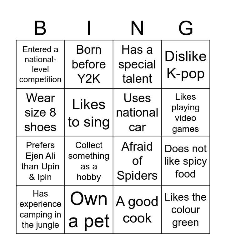 This bingo card has 16 words: Own a pet, Does not like spicy food, Has a special talent, Entered a national-level competition, Prefers Ejen Ali than Upin & Ipin, Born before Y2K, Afraid of Spiders, A good cook, Wear size 8 shoes, Likes to sing, Has experience camping in the jungle, Dislike K-pop, Collect something as a hobby, Likes playing video games, Uses national car and Likes the colour green.