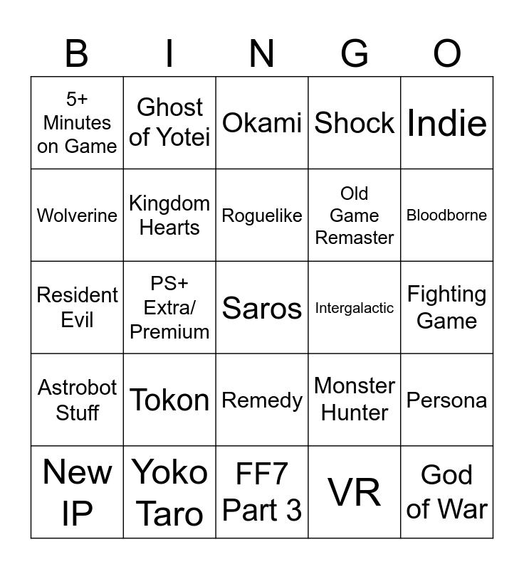 This bingo card has a free space and 24 words: Tokon, Yoko Taro, Roguelike, New IP, Indie, 5+ Minutes on Game, Wolverine, Ghost of Yotei, Intergalactic, Remedy, Old Game Remaster, Resident Evil, Monster Hunter, Persona, Kingdom Hearts, VR, Fighting Game, Okami, Bloodborne, PS+ Extra/ Premium, God of War, Astrobot Stuff, Shock and FF7 Part 3.