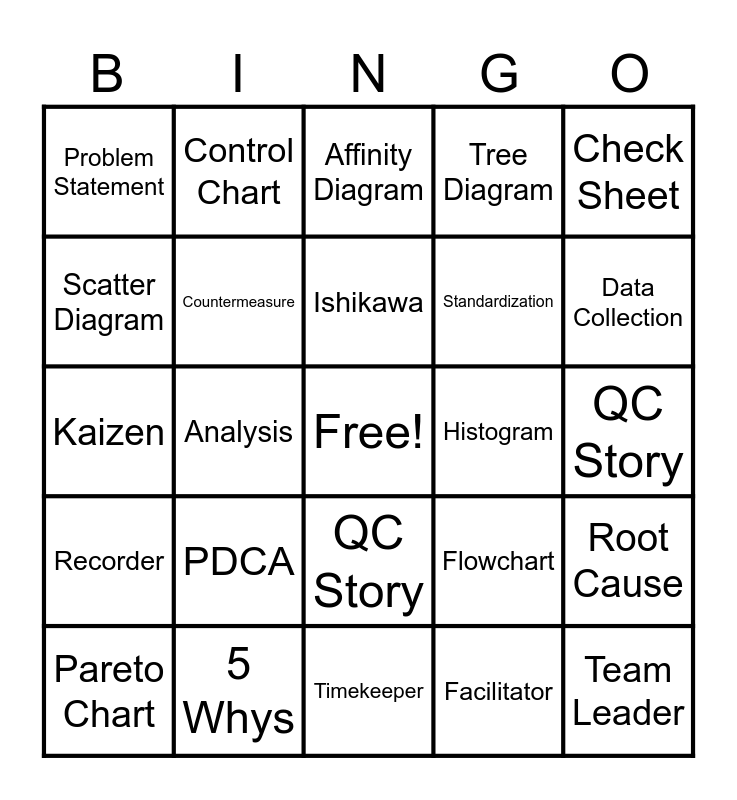 This bingo card has a free space and 24 words: PDCA, 5 Whys, Ishikawa, Pareto Chart, Check Sheet, Problem Statement, Scatter Diagram, Control Chart, Histogram, QC Story, Standardization, Kaizen, Flowchart, Root Cause, Countermeasure, Facilitator, QC Story, Affinity Diagram, Data Collection, Analysis, Team Leader, Recorder, Tree Diagram and Timekeeper.