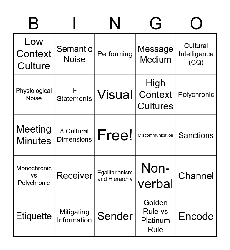 This bingo card has a free space and 48 words: Shared Meaning, Encode, Decode, Sender, Receiver, 1st step of Communication, Semantic Noise, Psychological Noise, Physiological Noise, Physical Noise, I-Statements, Message Medium, Channel, Non-verbal, Verbal, Written, Visual, Miscommunication, Stakeholder, Cultural Intelligence (CQ), 8 Cultural Dimensions, Golden Rule vs Platinum Rule, Low Context Culture, High Context Cultures, Monochronic, Polychronic, Etiquette, Individualism vs Collectivism, Egalitarianism and Hierarchy, Monochronic vs Polychronic, Ethnocentrism, Outgroup Homogeneity Effect, Projected Cognitive Similarity, Emotional Hijacking, Mitigating Information, Culture, Norms, Sanctions, Groupthink, Forming, Storming, Norming, Performing, Agenda, Meeting Minutes, Learner Mindset, Judger Mindset and test - backside.