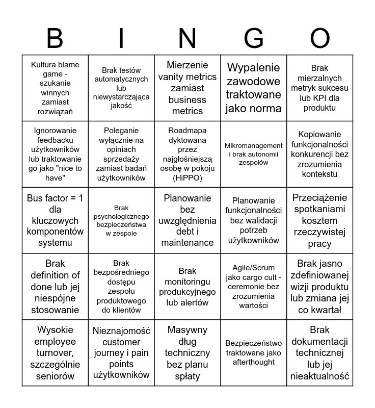 This bingo card has 25 words: Brak bezpośredniego dostępu zespołu produktowego do klientów, Masywny dług techniczny bez planu spłaty, Roadmapa dyktowana przez najgłośniejszą osobę w pokoju (HiPPO), Wysokie employee turnover, szczególnie seniorów, Brak mierzalnych metryk sukcesu lub KPI dla produktu, Kultura blame game - szukanie winnych zamiast rozwiązań, Ignorowanie feedbacku użytkowników lub traktowanie go jako "nice to have", Brak testów automatycznych lub niewystarczająca jakość, Planowanie funkcjonalności bez walidacji potrzeb użytkowników, Brak monitoringu produkcyjnego lub alertów, Mikromanagement i brak autonomii zespołów, Bus factor = 1 dla kluczowych komponentów systemu, Agile/Scrum jako cargo cult - ceremonie bez zrozumienia wartości, Brak jasno zdefiniowanej wizji produktu lub zmiana jej co kwartał, Poleganie wyłącznie na opiniach sprzedaży zamiast badań użytkowników, Brak dokumentacji technicznej lub jej nieaktualność, Przeciążenie spotkaniami kosztem rzeczywistej pracy, Mierzenie vanity metrics zamiast business metrics, Kopiowanie funkcjonalności konkurencji bez zrozumienia kontekstu, Brak psychologicznego bezpieczeństwa w zespole, Planowanie bez uwzględnienia debt i maintenance, Nieznajomość customer journey i pain points użytkowników, Brak definition of done lub jej niespójne stosowanie, Wypalenie zawodowe traktowane jako norma and Bezpieczeństwo traktowane jako afterthought.