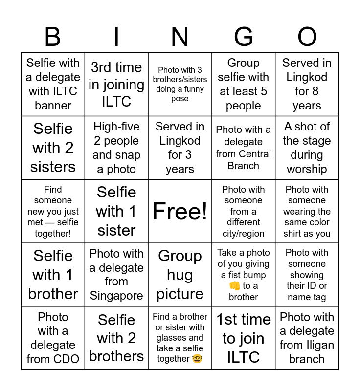 This bingo card has a free space and 24 words: Photo with a delegate from CDO, Photo with a delegate from Singapore, Served in Lingkod for 3 years, 1st time to join ILTC, Served in Lingkod for 8 years, Selfie with a delegate with ILTC banner, 3rd time in joining ILTC, Photo with 3 brothers/sisters doing a funny pose, Photo with someone from a different city/region, Photo with someone wearing the same color shirt as you, Find someone new you just met — selfie together!, High-five 2 people and snap a photo, Take a photo of you giving a fist bump 👊 to a brother, Photo with someone showing their ID or name tag, Selfie with 2 sisters, Selfie with 2 brothers, Find a brother or sister with glasses and take a selfie together 🤓, Group selfie with at least 5 people, A shot of the stage during worship, Selfie with 1 brother, Selfie with 1 sister, Group hug picture, Photo with a delegate from Central Branch and Photo with a delegate from Iligan branch.