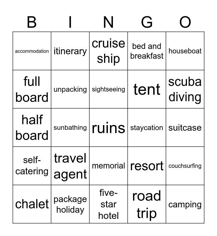 This bingo card has a free space and 24 words: travel agent, package holiday, sightseeing, chalet, houseboat, accommodation, full board, itinerary, staycation, memorial, tent, half board, resort, couchsurfing, unpacking, road trip, suitcase, cruise ship, scuba diving, sunbathing, camping, self-catering, bed and breakfast and five-star hotel.
