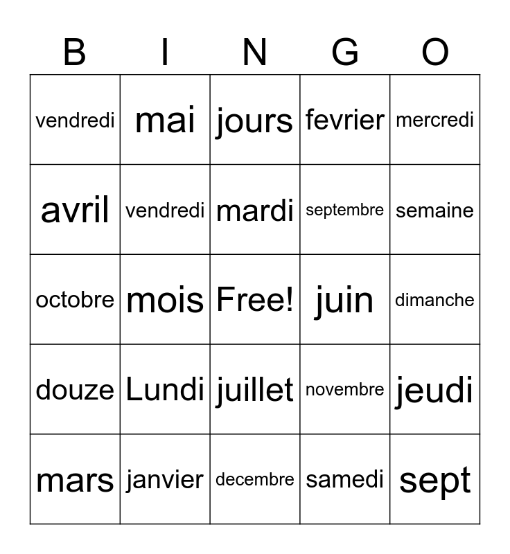 This bingo card has a free space and 24 words: Lundi, janvier, mardi, mars, mercredi, vendredi, avril, mai, juin, juillet, septembre, octobre, novembre, jeudi, vendredi, samedi, dimanche, jours, semaine, mois, sept, douze, fevrier and decembre.