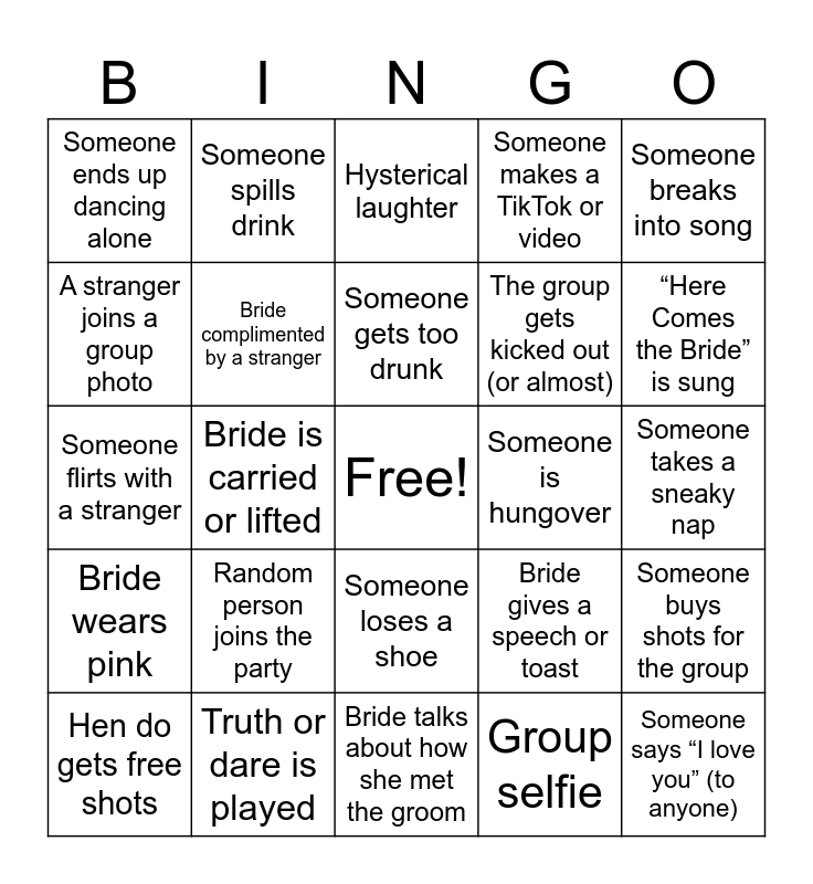 This bingo card has a free space and 34 words: Bride takes a shot, Group selfie, Bride gets a dare, Someone cries, Bride wears pink, Bride complimented by a stranger, Someone breaks into song, Hen do gets free shots, Someone spills drink, Bride impersonates the groom, Someone gets too drunk, Hysterical laughter, The bride gets embarrassed, Someone makes fun of the groom, Someone is hungover, “Here Comes the Bride” is sung, Truth or dare is played, Someone flirts with a stranger, Random person joins the party, Bride gives a speech or toast, Someone loses a shoe, Group chant or cheers, Someone ends up dancing alone, Someone takes a sneaky nap, Bride talks about how she met the groom, Someone says “I love you” (to anyone), Someone makes a TikTok or video, Someone cries happy tears, The group gets kicked out (or almost), A stranger joins a group photo, Someone FaceTimes someone not there, Bride is carried or lifted, Someone buys shots for the group and Bride is serenaded.