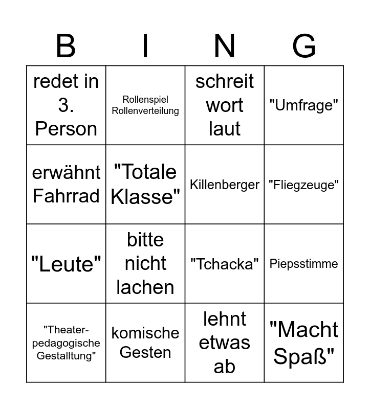 This bingo card has 16 words: komische Gesten, Piepsstimme, schreit wort laut, redet in 3. Person, "Leute", Rollenspiel Rollenverteilung, "Tchacka", lehnt etwas ab, erwähnt Fahrrad, "Totale Klasse", "Theater-pedagogische Gestalltung", "Umfrage", bitte nicht lachen, "Fliegzeuge", Killenberger and "Macht Spaß".