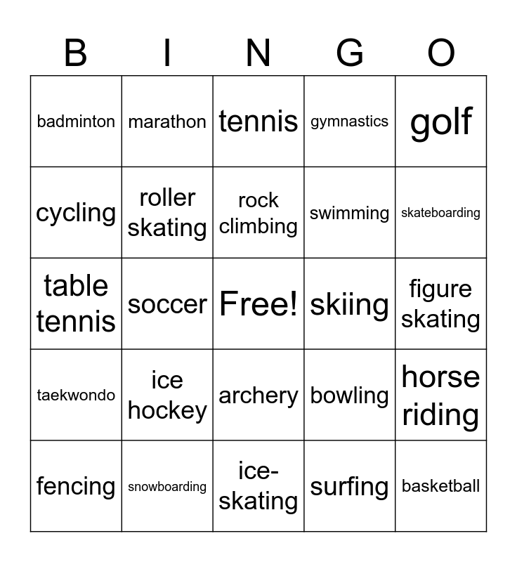 This bingo card has a free space and 29 words: fencing, baseball, soccer, volleyball, badminton, tennis, roller skating, ice hockey, skiing, snowboarding, figure skating, basketball, ice-skating, surfing, skateboarding, boxing, archery, taekwondo, golf, table tennis, bowling, jump rope, swimming, cycling, gymnastics, marathon, horse riding, rock climbing and hiking.