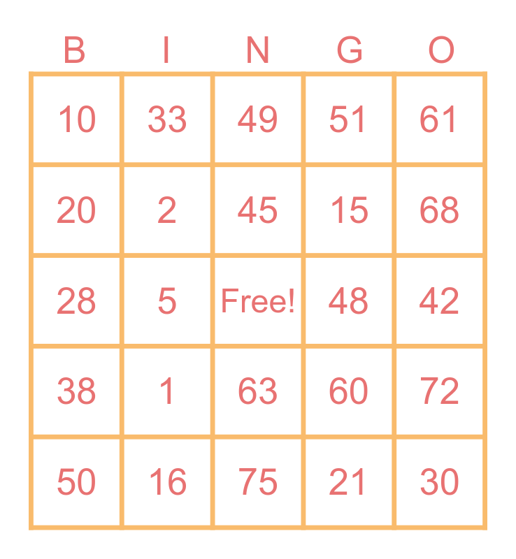 This bingo card has a free space and 24 words: 1, 16, 45, 50, 61, 10, 20, 33, 48, 63, 15, 28, 60, 72, 2, 21, 42, 49, 68, 5, 30, 38, 51 and 75.