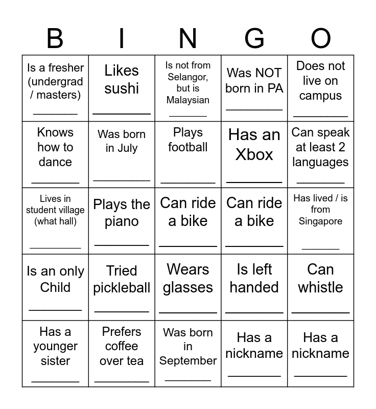 This bingo card has 33 words: Has a nickname _______, Is wearing jeans ________, Plays the piano _______, Has a pet _______, Is an only Child _______, Was born in July _________, Does not live on campus ________, Has a younger sister _______, Likes sushi _______, Can whistle _______, Plays football ________, Is not from Selangor, but is Malaysian _______, Is a returner _______, Is wearing black ________, Can ride a bike _______, Can speak at least 2 languages _______, Prefers coffee over tea ________, Lives in student village (what hall) __________, Tried pickleball _______, Is left handed _______, Wears glasses _______, Does AU sports _______, Is a fresher (undergrad / masters) _______, Has lived / is from Singapore _______, Was born in September _______, Can ride a bike _______, Was NOT born in PA ________, Has an Xbox ______, Knows how to dance _______, Can whistle _______, Enjoys Camping _______, Has a nickname _______ and Can skateboard ________.